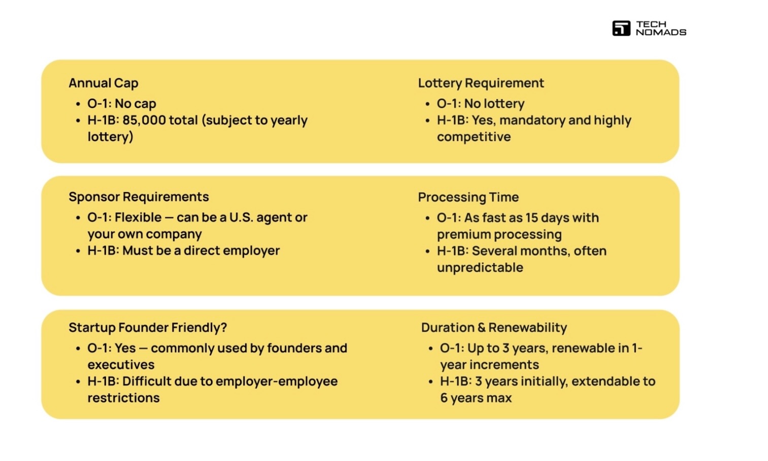 Unlike the H-1B, which is subject to an annual lottery with a hard cap (currently 85,000 total spots), the O-1 has no numerical limit. This makes it far more predictable — especially for founders who can’t afford to wait and gamble on a draw.
